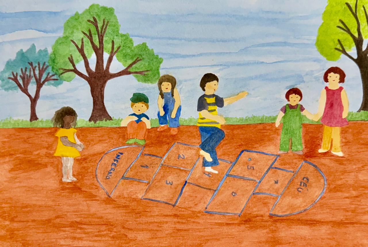 E siga assim, até chegar ao grande desafio: conseguir acertar a sua pedrinha na casa 10! Fazer todo o percurso, recolher a sua pedrinha e terminar a sua parte na brincadeira! Lembrando que, se você conseguir chegar até a casa 10, desta vez, você poderá pisar com os dois pés na casa CÉU! Porque você conseguiu terminar todo o percurso da amarelinha! Parabéns! Mas, não se esqueça: na volta, quando você chegar na casa 1, lembre-se sempre de saltar a casa INFERNO para somente então ser considerada terminada a brincadeira!